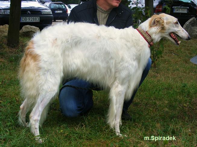 "średniej wielkości suka, bardzo proporcjonalna i elegancka, o pięknej suczej głowie, doskonałej jakości włosie, doskonałym katowaniu kończyn przednich i tylnych, prawidłowej linii grzbietu, o doskonałym ale leniwym ruchu, głębokiej klatce piersiowej i nieco krótkiej szyji."