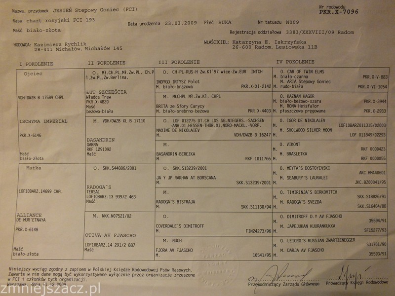 JESIEŃ, historia tej suczki jest niezwykle smutna. Została sprzedana do Radomia Pani Katarzynie Iskrzyńskiej. Wcześniej kupiła także suczkę od Pana Kazimierza-ISOLĘ FORTUNATĘ. Obie suczki widziałam raz jeden na wystawie psów w Radomiu, były bardzo zaniedbane, a jedna z nich wyrażnie utykała na tylną łapę. Jak się pózniej okazało, obie suczki nie trafiły dobrze. Ich właściciele w chwili przyjazdu do hodowli zrobili dobre wrażenie na Panu Kazimierzu. Prawda okazała się inna. Byli to pijacy i kłusownicy. Jakiś czas pózniej, ktoś przez przypadek odkrył ogłoszenie na Alegratka.pl, że JESIEŃ jest wystawiona na sprzedaż. Zdjęcia pokazują, jak bardzo była zaniedbana. Wykupiło ją towarzystwo "Pomoc Chartom", dzięki któremu sunia trafiła do nowego kochającego domu i otrzymała nowe życie. Czasami można ją zobaczyć na cursingach.